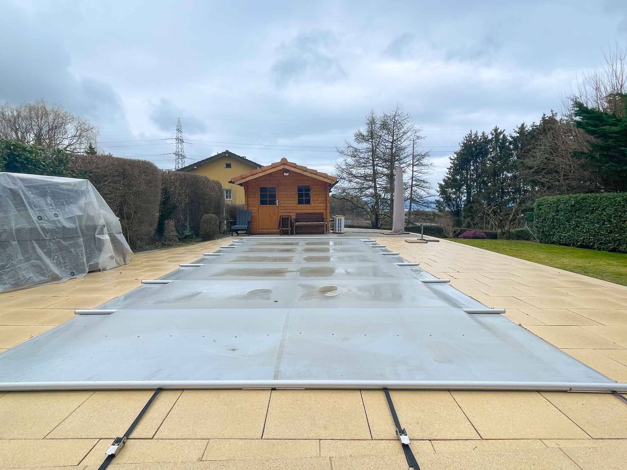 A l'extérieur se trouve un grand garage fermé avec porte automatique ainsi